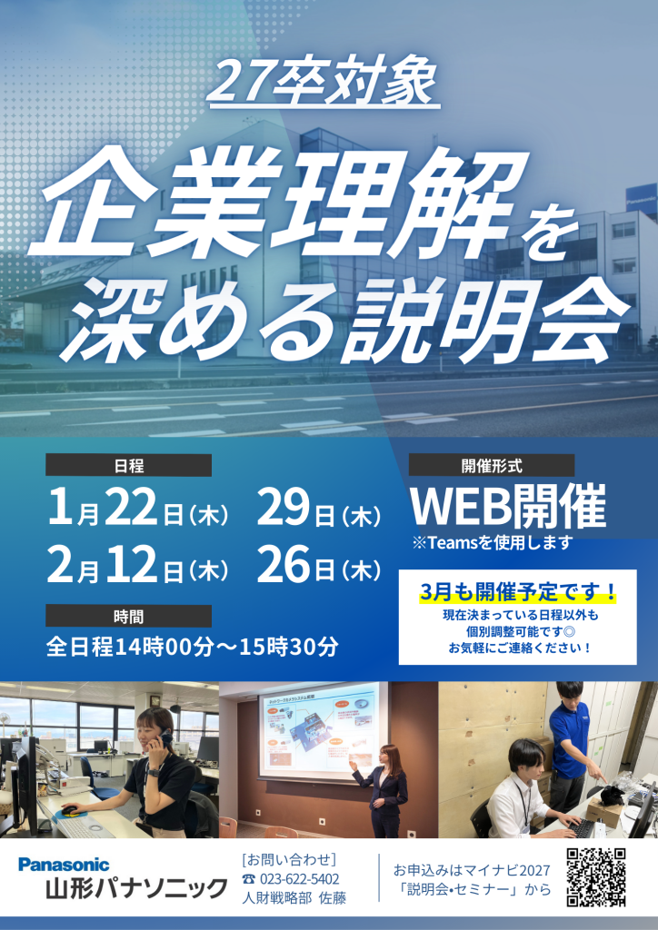 場 所 :山形パナソニック 本社 (山形市平清水) 地図 もしくはオンライン ※会社説明会や選考スケジュールに関する情報は、マイナビ2027にて随時お知らせいたします。 |